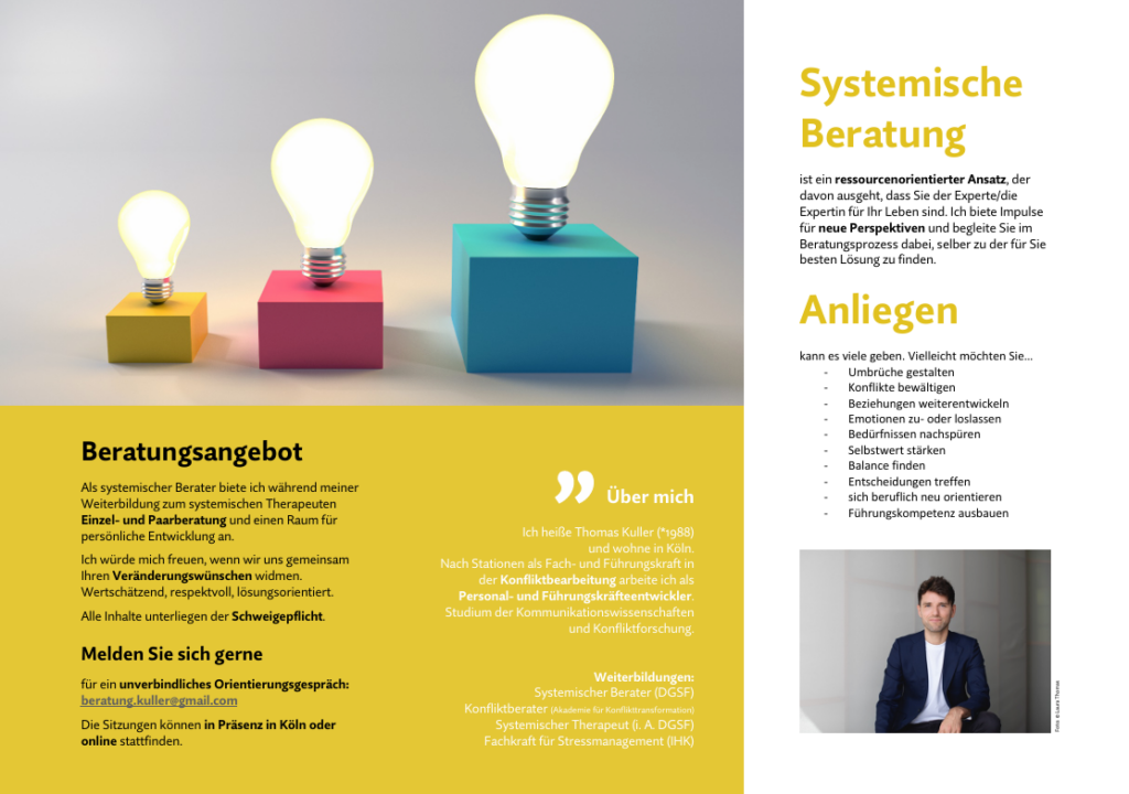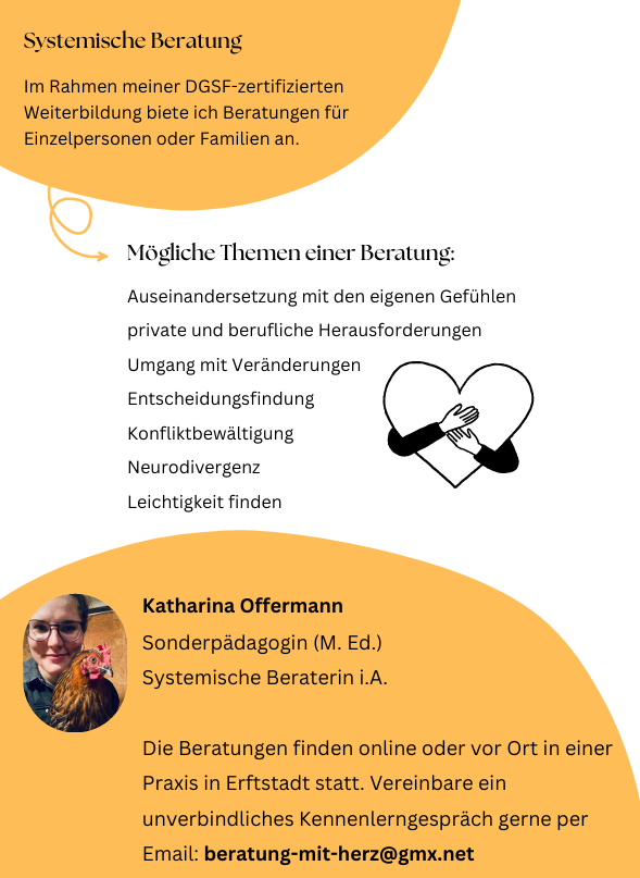 Auf dieser Seite stellen wir Ihnen angehende Systemische Berater*innen vor, die während Ihrer Ausbildung ihr Beratungsangebot kostenlos oder für einen geringen Unkostenbeitrag zur Verfügung stellen.