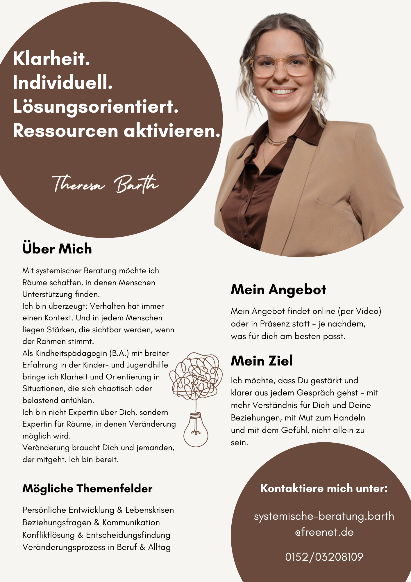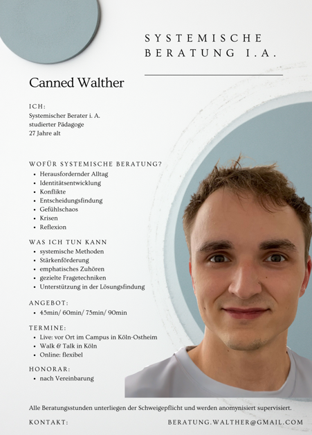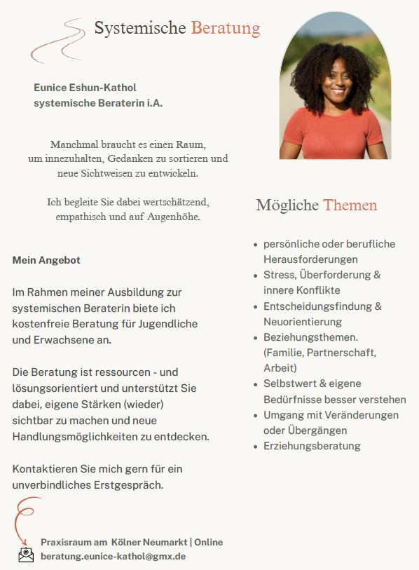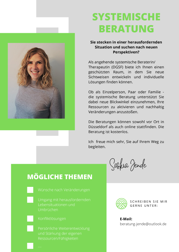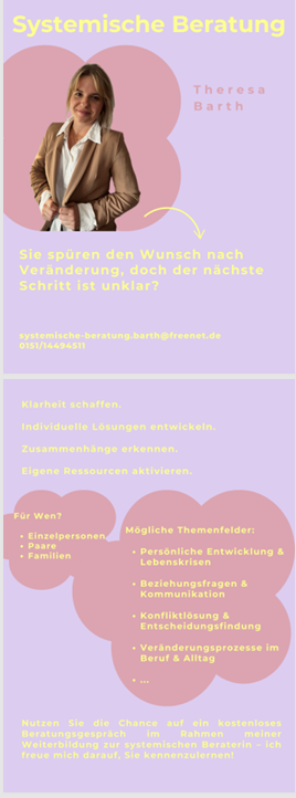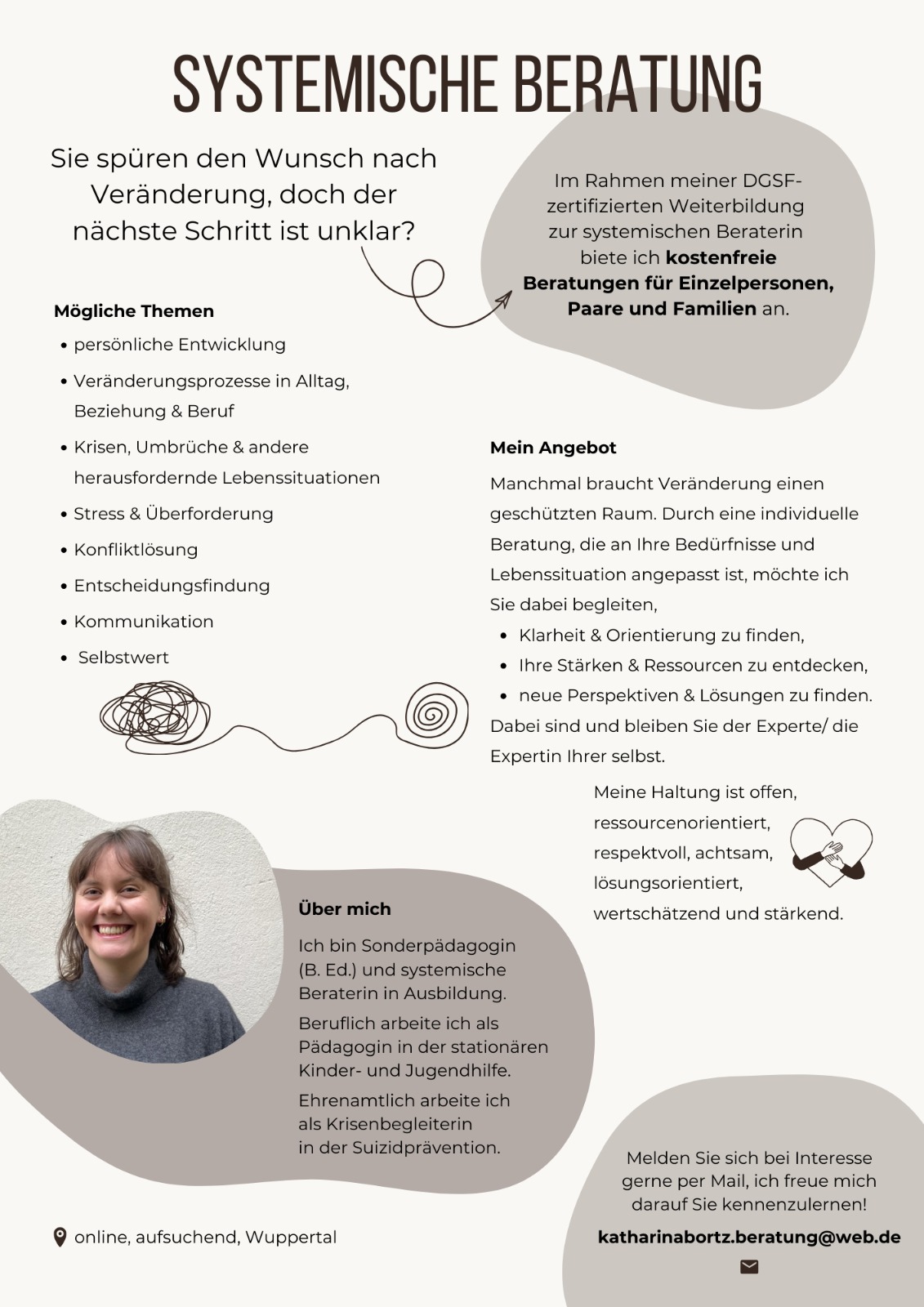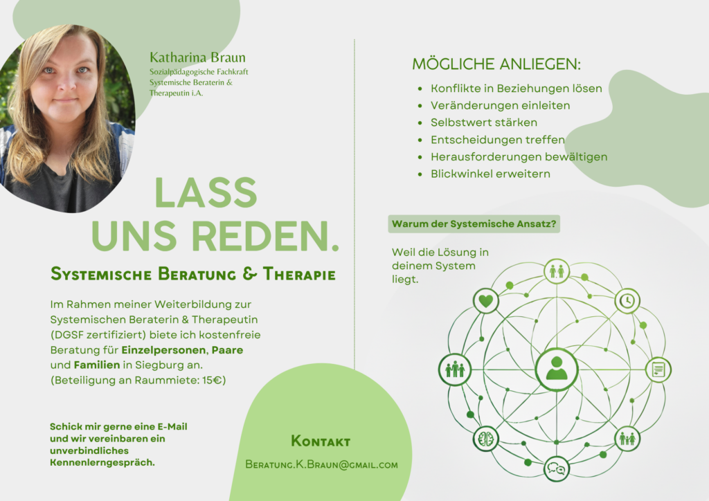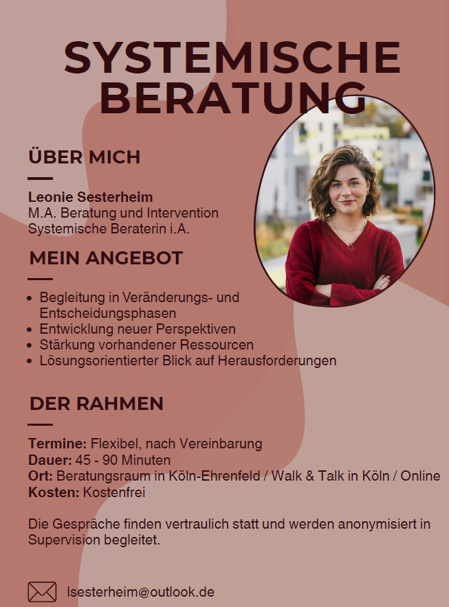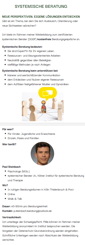 Auf dieser Seite stellen wir Ihnen angehende Systemische Berater*innen vor, die während Ihrer Ausbildung ihr Beratungsangebot kostenlos oder für einen geringen Unkostenbeitrag zur Verfügung stellen.