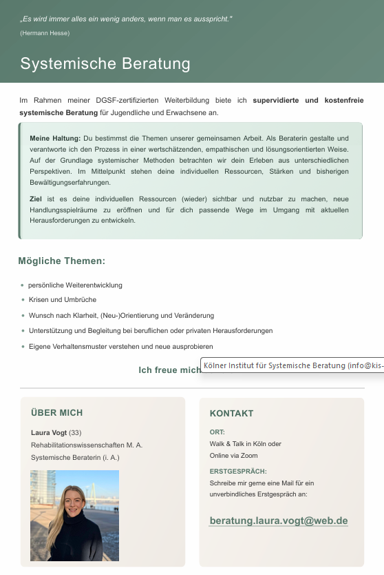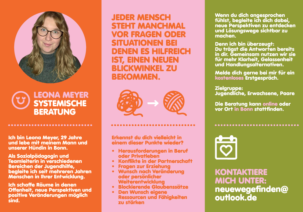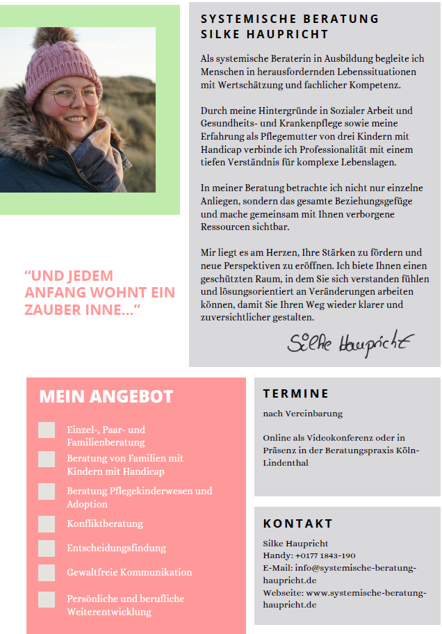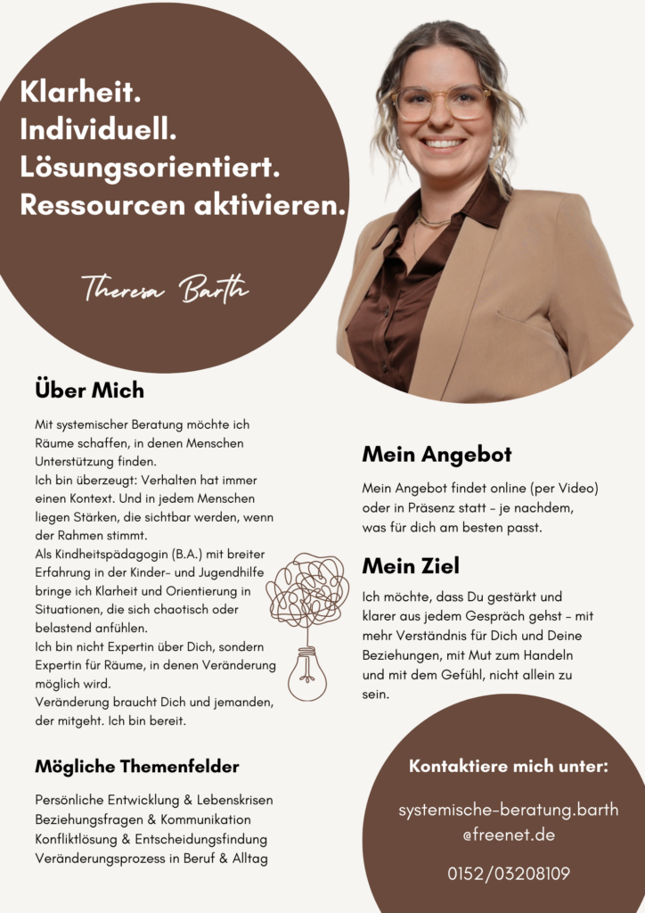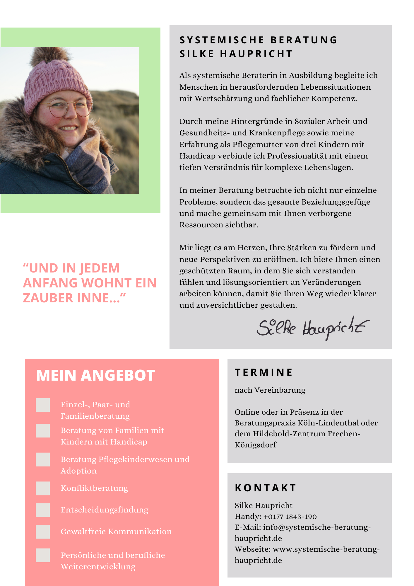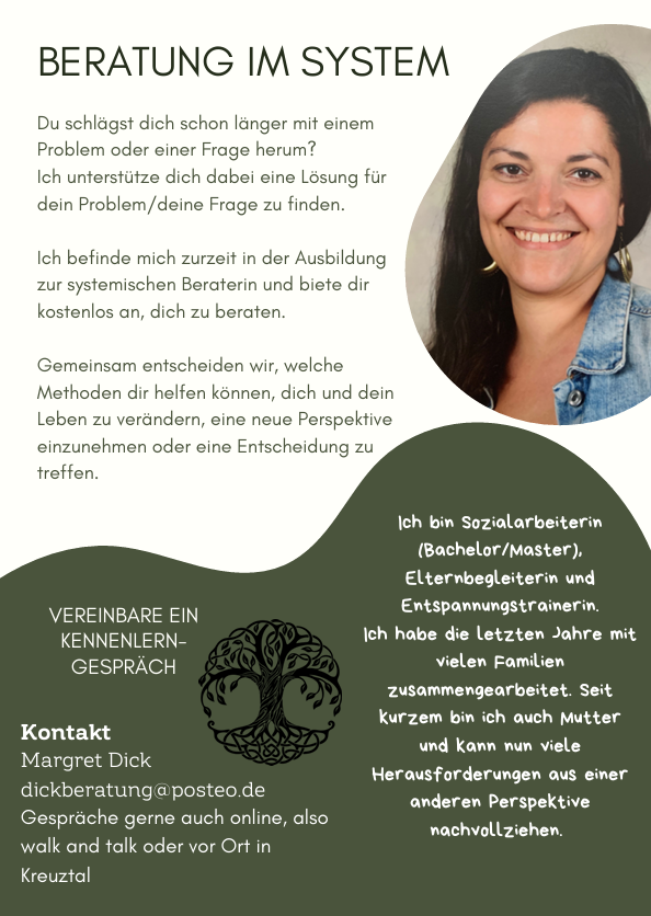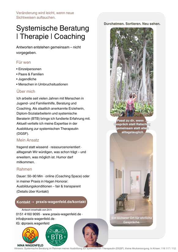 Auf dieser Seite stellen wir Ihnen angehende Systemische Berater*innen vor, die während Ihrer Ausbildung ihr Beratungsangebot kostenlos oder für einen geringen Unkostenbeitrag zur Verfügung stellen.